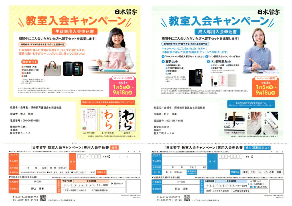 書道は創造力・集中力・忍耐力が向上します。当教室では、用具を持参する必要がありません。使いやすい適切な用具を備えていますので、気持ちよく学ぶことができ、効率的に技術向上します。